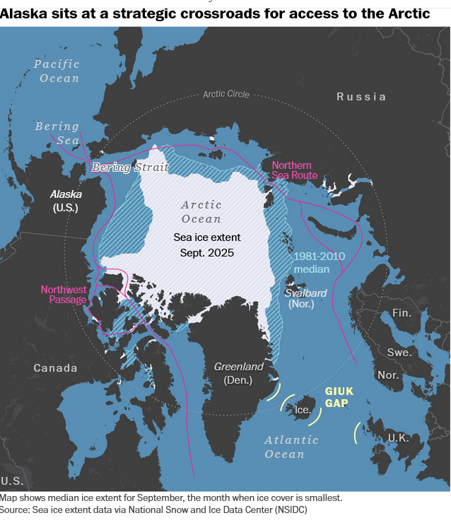 The administration is correct in acknowledging the Arctic’s rapidly increasing importance. Still, as others and I pointed out, China has more to fear from us regarding the new Arctic trade routes than we do from it. This map makes it obvious where the choke point for both routes lies, and it isn’t Greenland. It is already part of the U.S., our state of Alaska: