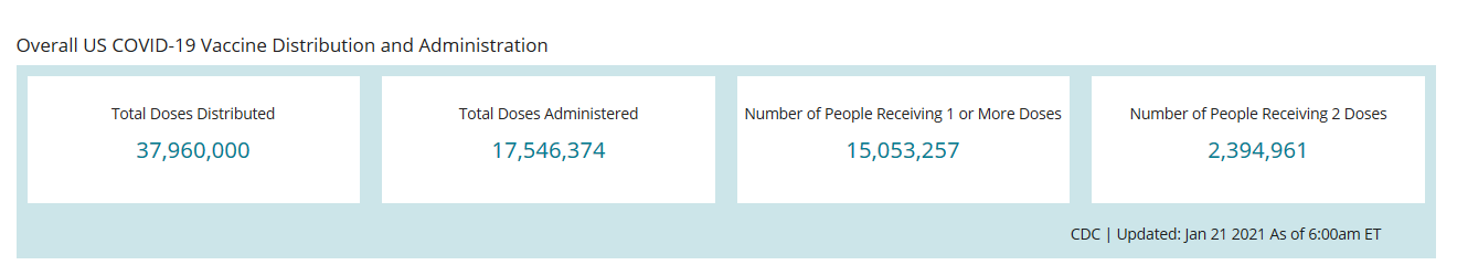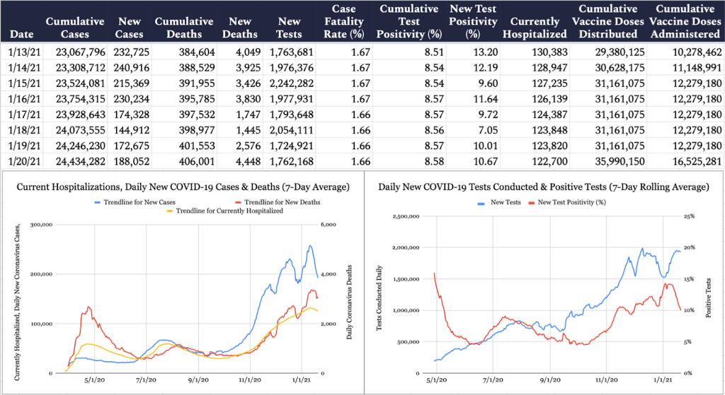 It helps to see exactly where we were on Inauguration Day. The facts are, the virus has passed its apogee and is receding. Vaccine distribution is already on the pace to exceed 100 million doses in his first hundred days. The charts from 1/20 from Johns Hopkins and numbers from the CDC serve as base points.