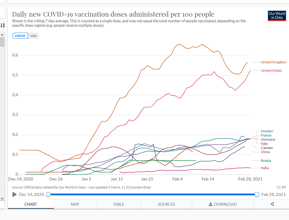 As predicted, the Biden vaccine lie grows. Watching Fareed Zakaria and Bill Gates agreeing on CNN how terrible our vaccine roll-out has been is enough to make one ill. How dumb do they think we are? Sad to see Gates in this role. Just a glance at this graph proves this isn’t true. Only the much smaller and less diverse U.K. among the majors has done marginally better. Bolstered with the approval of Trump’s Warp Speed Vaccine from J & J, we”ll do even better:
