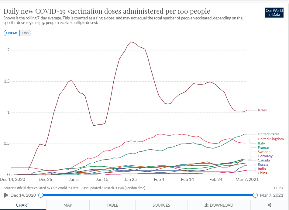 As I pointed out in the last post, the U.S. and U.K. are way out in front of vaccinating people (see chart below) among larger nations. Former assistant HHS Secretary in the Trump administration, Adm. Brett Giroir, pointed out that this success is 99% due to the Warp Speed Program’s initiated before the administration change.