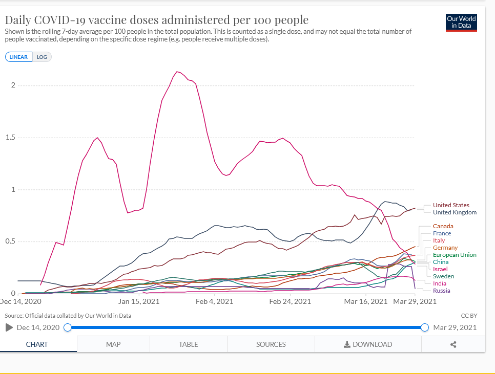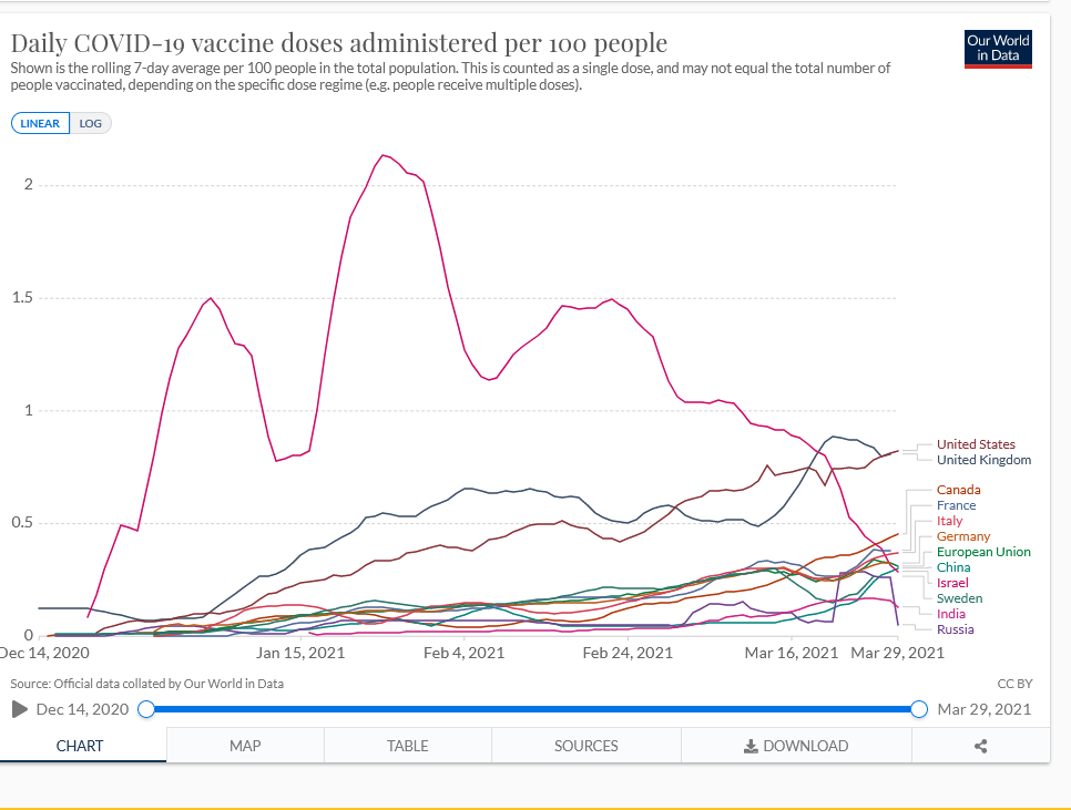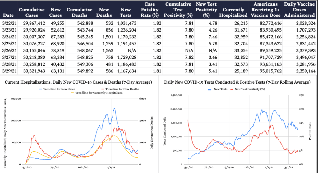 Even with rising Covid cases primarily in New York, New Jersey, and Michigan, the outlook for herd immunity this spring is still on course. Our vaccination rate keeps going up. Strange, cases are in strict lockdown states. A quick-thinking administration might rush our stored tens of millions of AstraZeneca doses to those states to arrest the spread. Unfortunately, quick-thinking and Biden don’t go together.
