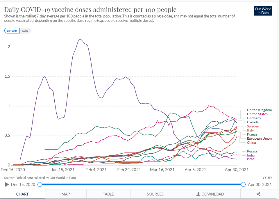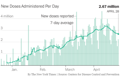 If this wasn’t bad enough, a tiny amount of blood clots showing up after J & J shots caused the government to pause the vaccine’s use. The UK faced a similar problem with the AstraZeneca vaccine and looked at the risk-reward data, only added a warning label. Predictably, we have greater hesitantly not only towards J & J but the other vaccines as well. All this has resulted in a sharp falloff in our vaccination rate: