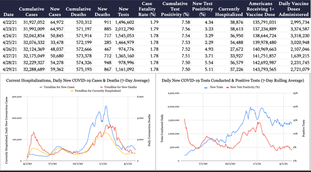As I said, the Biden administration could only screw things up, and apparently, they have. This vaccine slowdown could diminish our rapid economic recovery. The 6.4% first-quarter GDP growth built on solid 4th quarter 2020 gains. The Biden administration wasn’t around long enough to impact the numbers, but its actions since they took power could harm or even derail the recovery. The reopening of the economy with pent-up spending started mainly in the Red states and is now is spreading to finally opening up Biden Blue States. Continued progress putting Covid under control is essential to continued success.