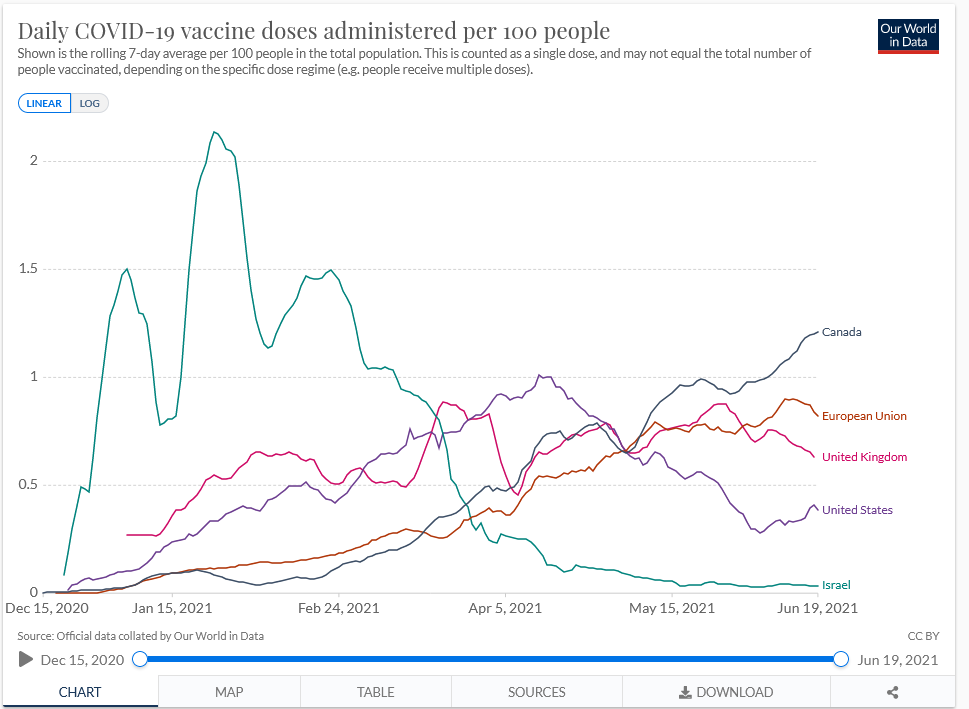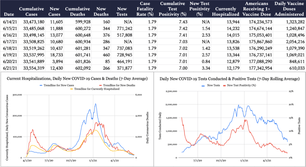 We have finally stabilized our Covid vaccination rates, after the Biden Administration missteps. In any case, with growing Herd Immunity the pandemic continues to fade away. Much as this is a surprise to the Biden administration and Fauci & friends, real scientists such as Dr. Marty Makary forecast it. He predicted in the Wall Street Journal we would see Herd Immunity by the end of April. Roundly ridiculed, he has the last laugh. Thank goodness! I included these graphs so you could see the facts rather than absorbing media misinformation. You knew who was right and who was Fauci.