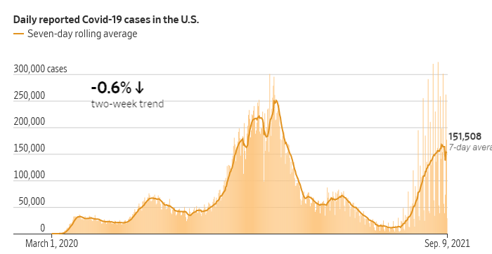 I and others have predicted the Delta variant would peak before fall. We also foretasted the previous variants would peak no later than May. Totaling those vaccinated and naturally immune and factoring in the variant’s ability to spread led to a correct call then, and it appears we’ll be right again. From the Wall Street Journal: