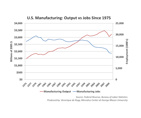Further, this stance has little factual basis. Automation replaced far more workers than outsourcing. In both cases, high labor costs in the U.S. forced employers to make economic decisions. However, manufacturing continues to grow here even as manufacturing jobs decline.