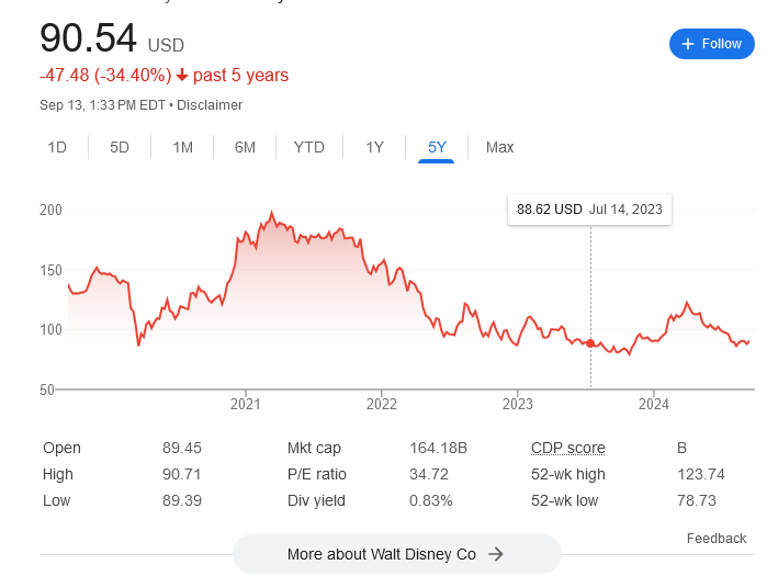 The approximately half the country Disney loathes avoid it. Disney is a laggard because of poor, biased management, as seen by its stock chart: