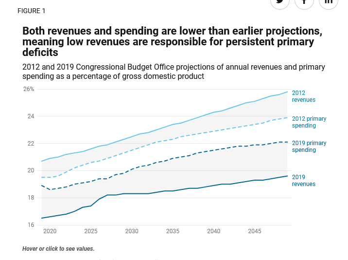Zakaria and others on the left rely on the Congressional Budget Office’s projections that show if we didn’t cut taxes, receipts would grow to well over 20% of GDP, matching expenses. The fact that we have never experienced this outcome from past tax increases erodes any faith in the CBO projections. Given the CBO’s major flubs in the past, this is wise. Yet, the CBO has projected reaching over 20% of GDP if we raise taxes as the Obama administration proposed:::
